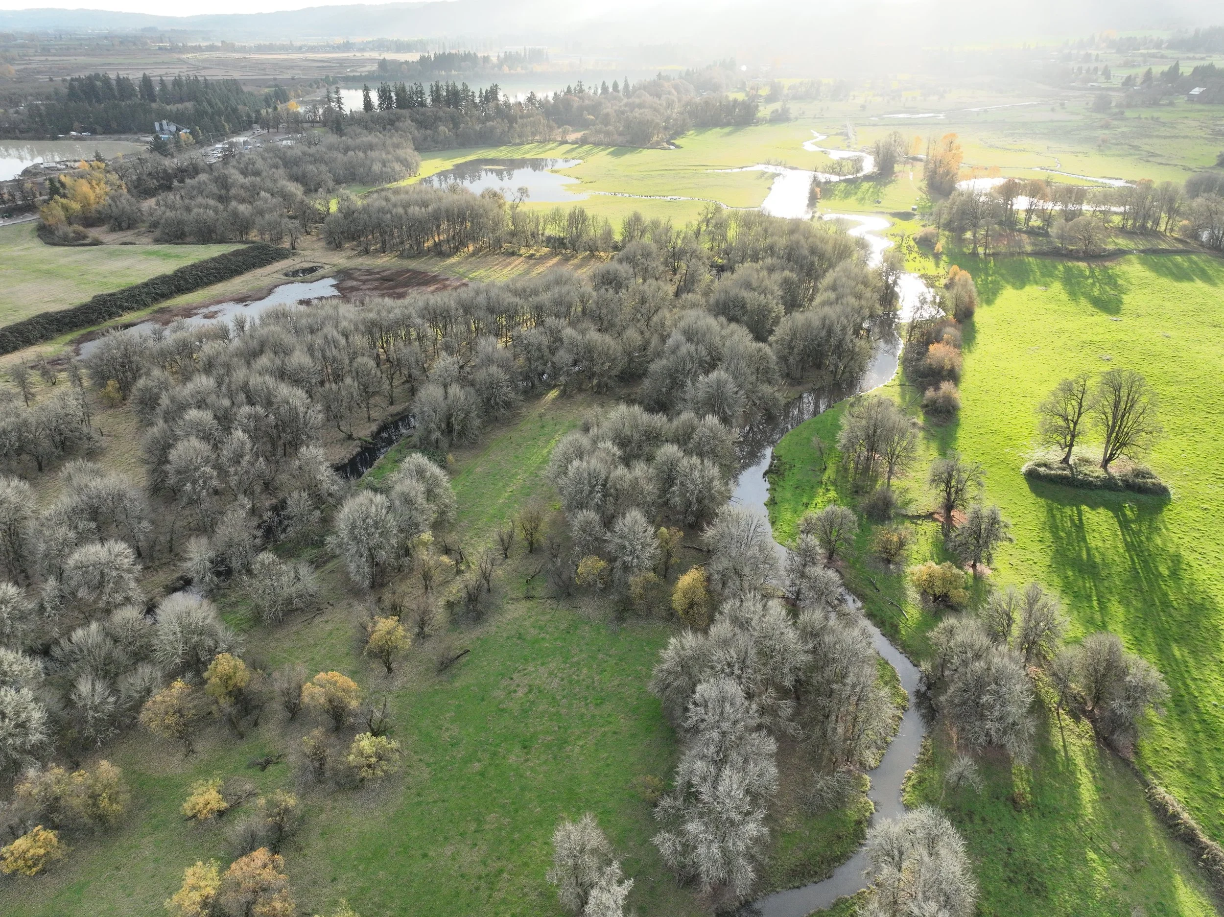 The project is being developed on a portion of the Hogan Road Ranch, just outside of Scappoose, Oregon. The site is part of a large, seasonal cattle ranch where the ranching will cease on the bank portion of the property. Scappoose Creek and Teal Creek are tidally influenced tributaries to the Columbia River that substantially influence the site’s hydrology. Decades of cattle ranching have disturbed the native groundcovers and shrub-layer, and introduced non-native vegetation like reed canarygrass. A mature Oregon ash canopy covers a good portion of the site. GreenWorks has conducted site reconnaissance of the plant communities and has worked with the project team in assessing opportunities for enhancement and restoration, and in identifying where grading could improve habitat connectivity.