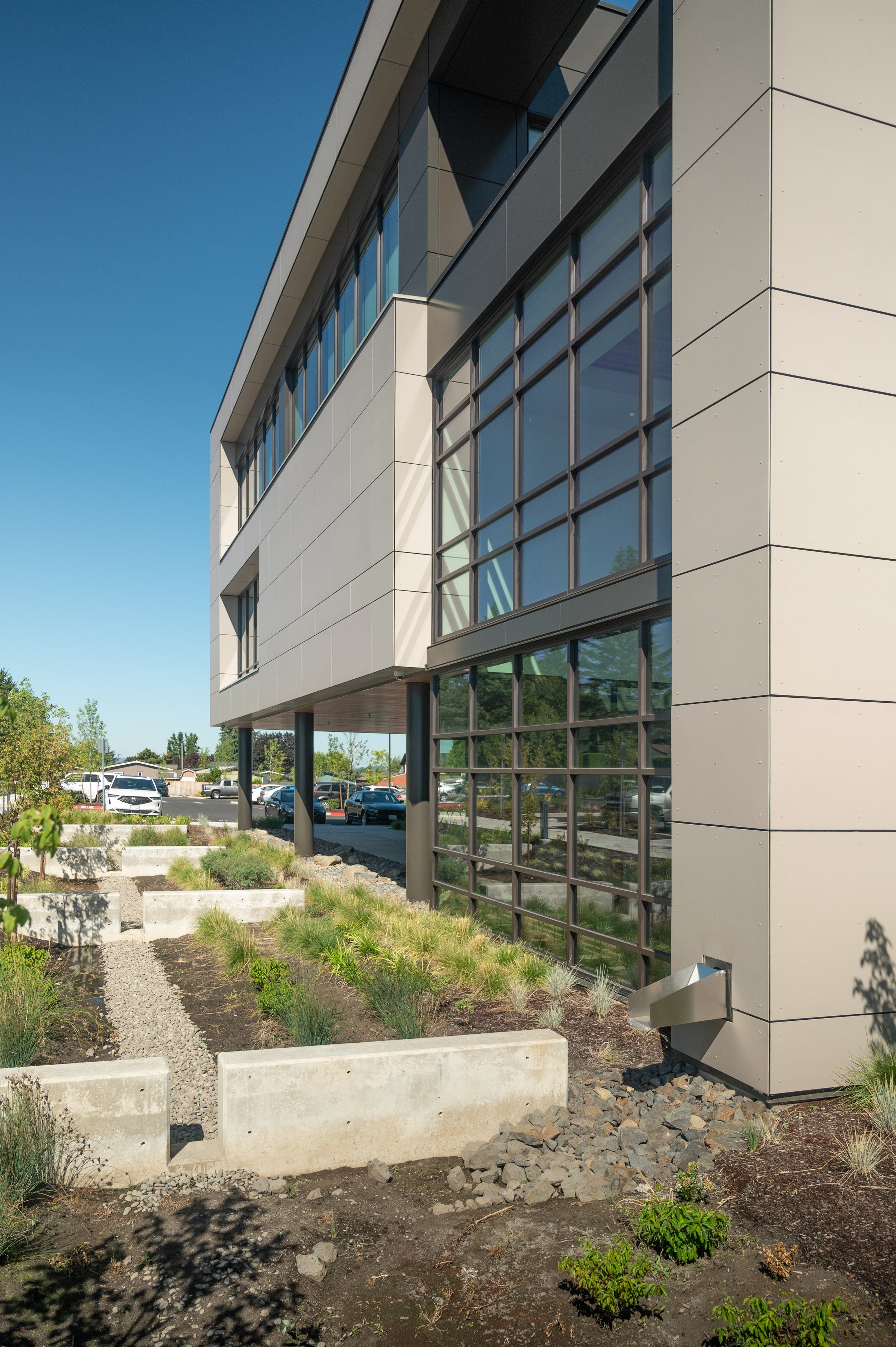 This new multi-service center in Gresham is a collaboration with TVA Architects and Rubicon Development. The new building houses a range of social support services, for families in East Multnomah County. The demand for larger parking areas required significant buffering from adjacent residential zones, and incorporation of accessible paths, trees, and landscape to minimize larger paved areas. Landscape strategies include a welcoming courtyard entry flanked by stormwater swales, along with significant stormwater infrastructure woven through the parking areas to manage water quality and provide visible ecological processes while allowing for views of nature from inside the facility.