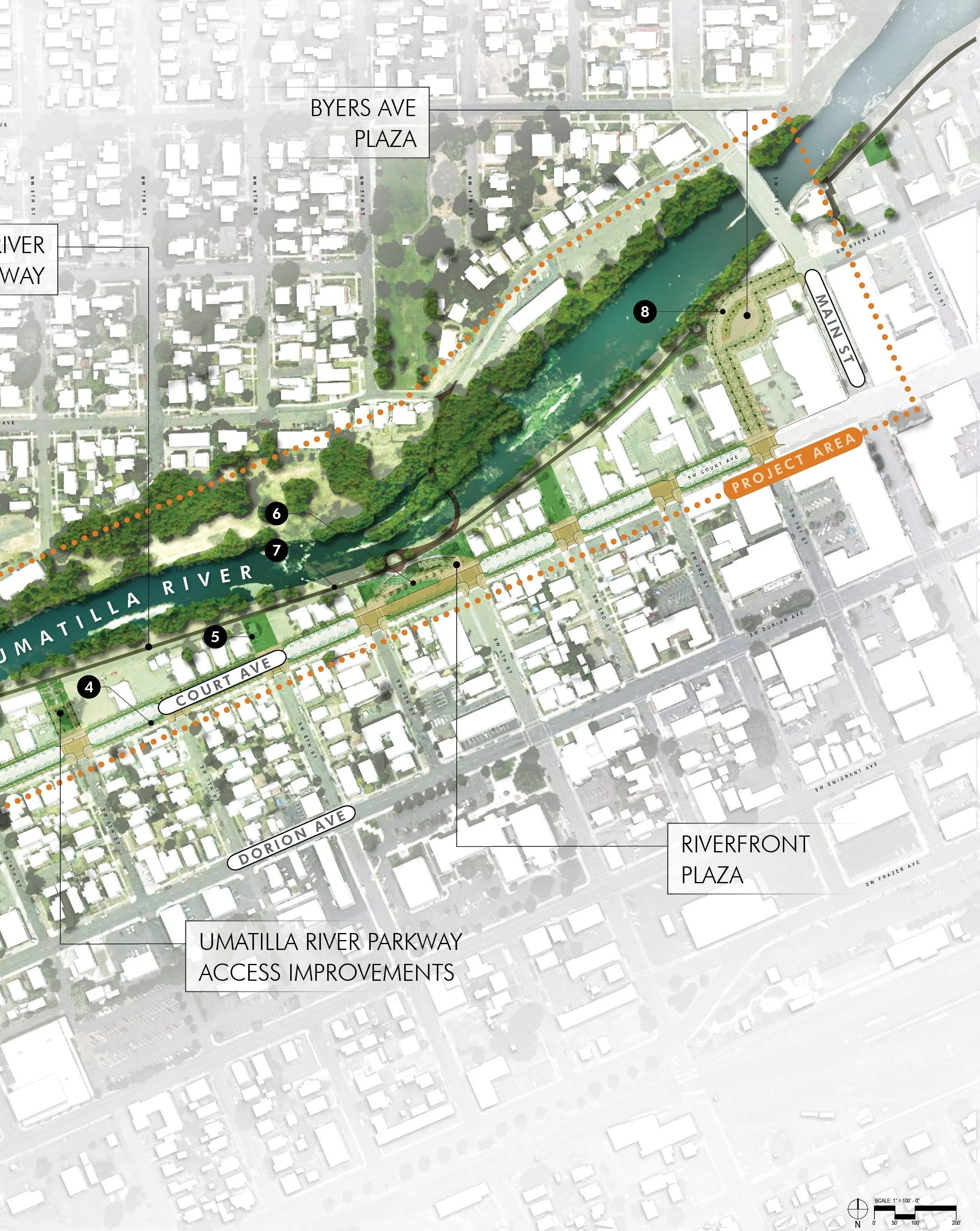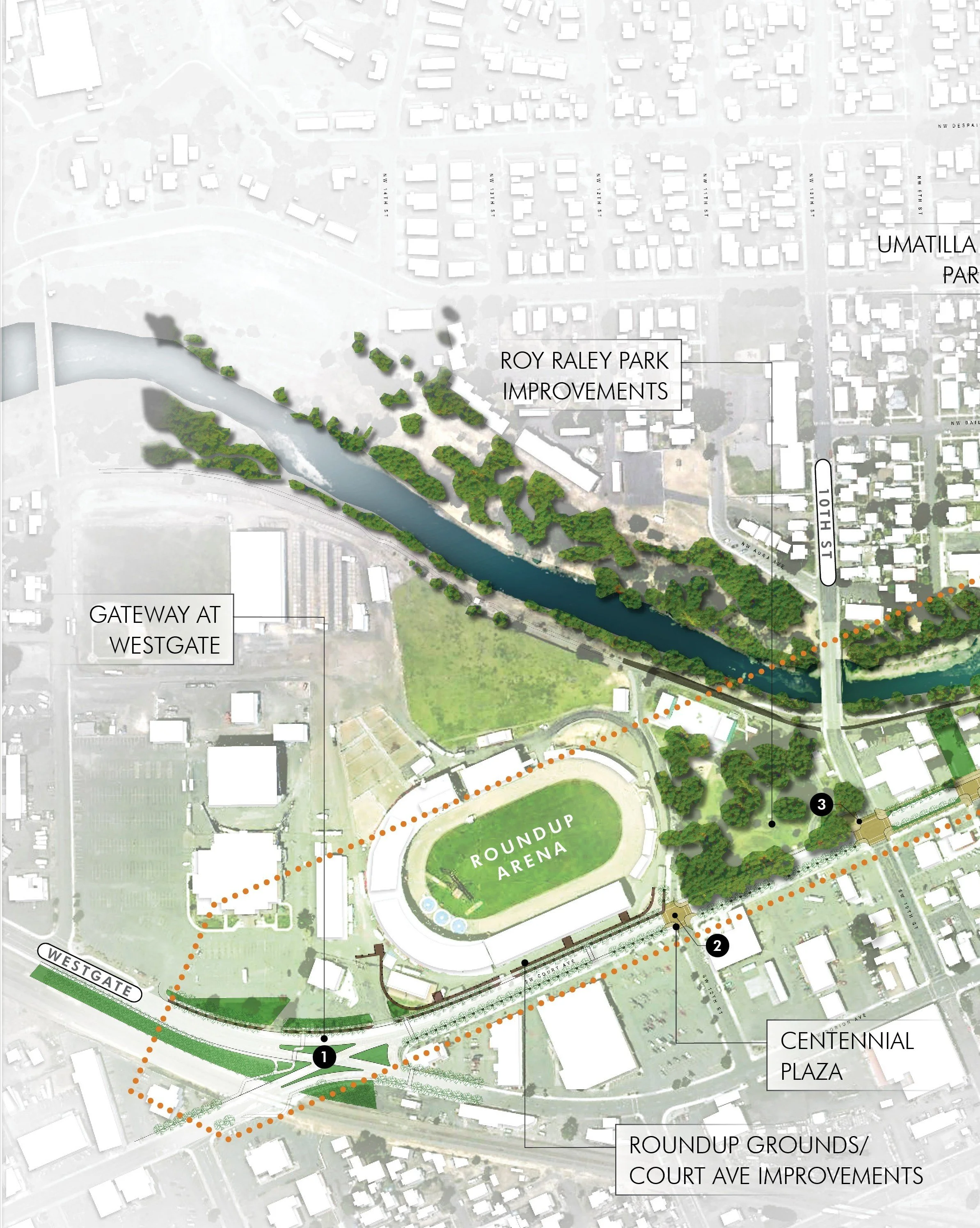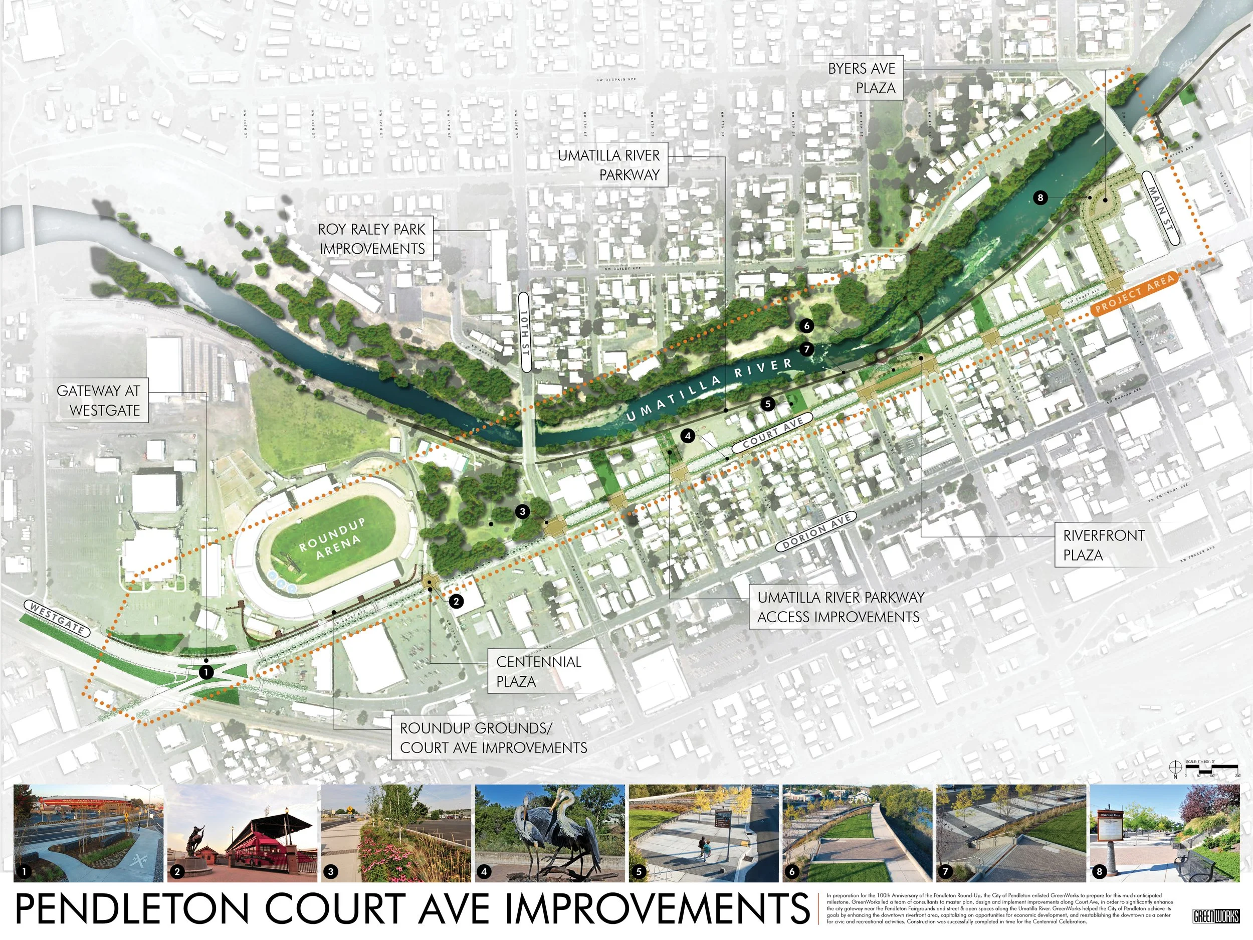 This Master Plan included four major projects, for which GreenWorks provided design and construction phase services: US 30 Westgate Intersection Gateway Project (implemented by ODOT), Pendleton Round-Up Grounds Court Avenue Right-of-Way Improvements (implemented by ODOT), Centennial Plaza and Round-Up Grounds Improvements, and Riverfront Plaza (implemented by the City of Pendleton). These projects demonstrate GreenWorks’ ability to design transportation infrastructure that integrates thorough-fares and highways to community-focused streetscapes with elements such as parking, placemaking, stormwater and multimodal strategies. GreenWorks conducted extensive public involvement efforts throughout the process to arrive at designs that reflected the priorities and expectations of Pendleton residents.