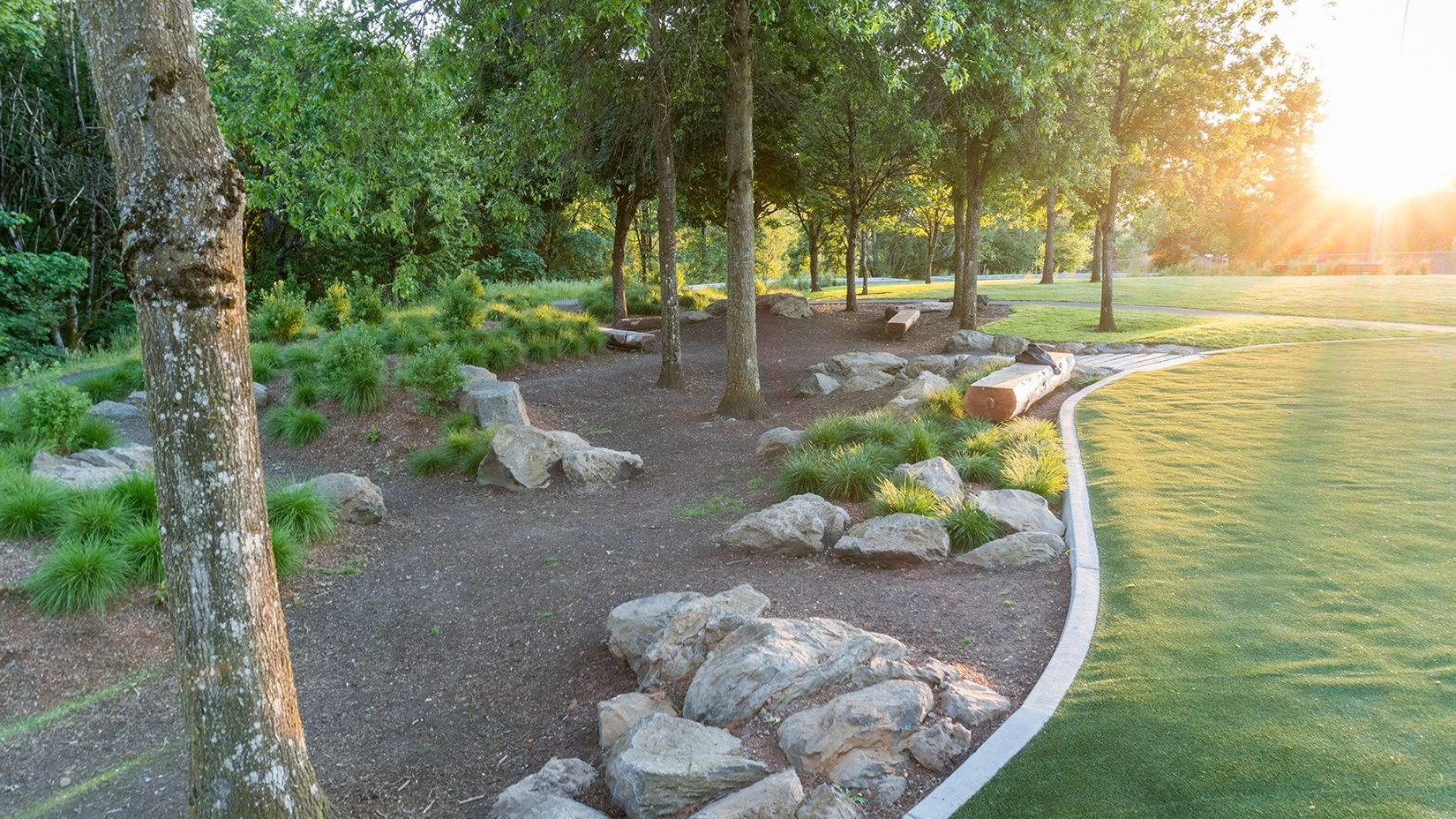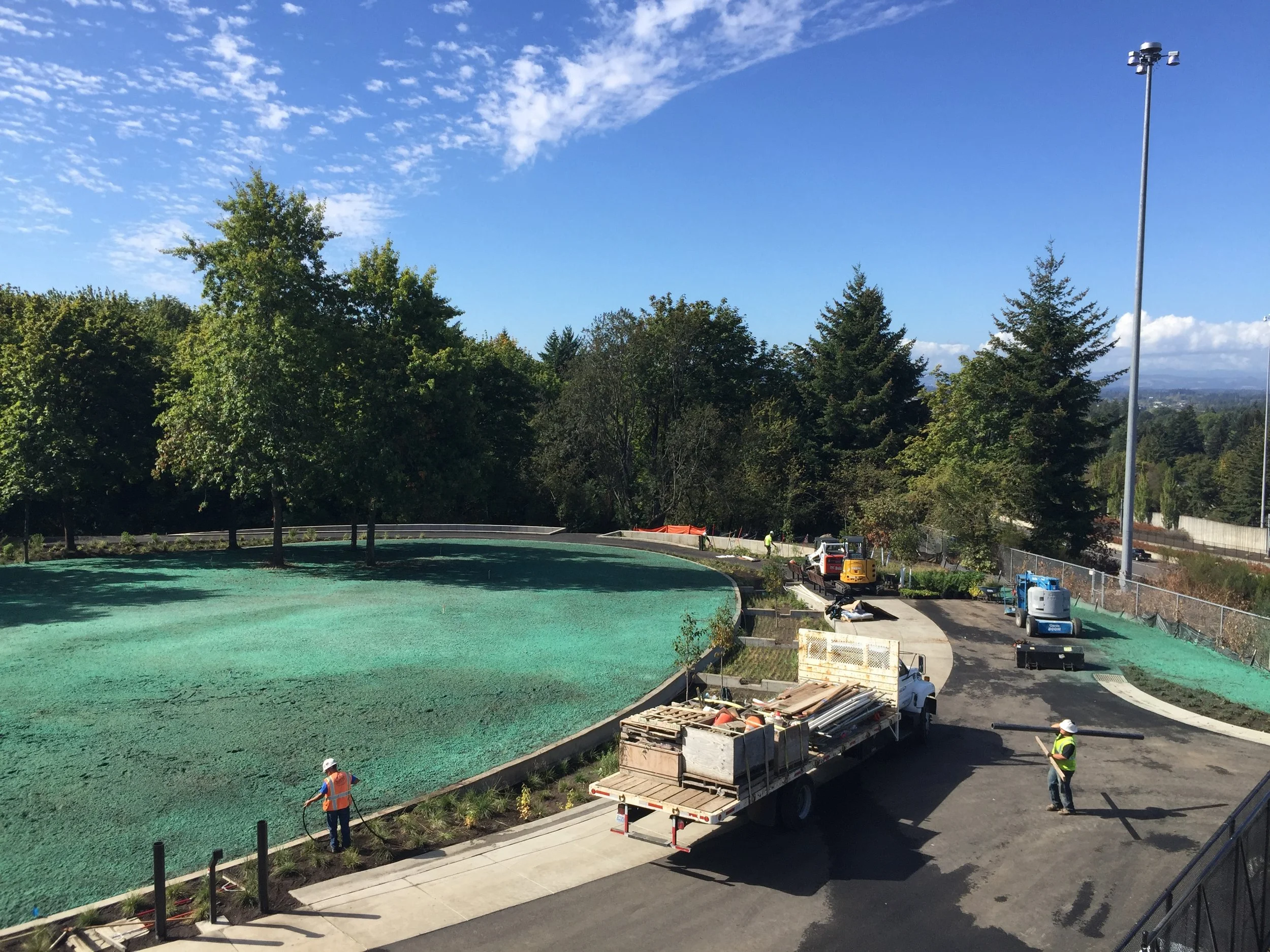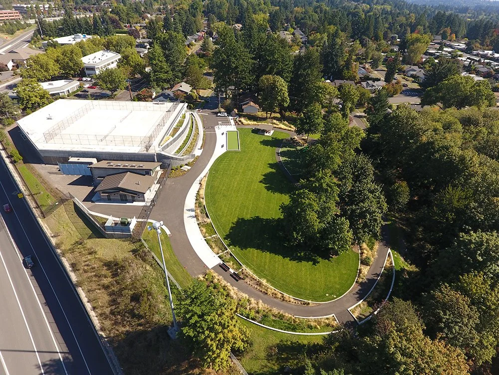 GreenWorks aided Tualatin Valley Water District (TVWD) in replacing an outdated reservoir with a new one adjacent to Ridgewood View Park in Beaverton. The new water project required extensive piping and construction staging on the Tualatin Hills Parks and Recreation District (THPRD) park site. In turn, TVWD needed to upgrade the amenities in Ridgewood View. GreenWork’s proposed new park elements including open lawn, paths, parking, picnic shelters, access to natural areas, playgrounds, and a bocce ball and tennis court on top of the reservoir. Innovative elements for the project included terraced rain gardens that treat and convey stormwater from the roof of the reservoir. The park’s new rain gardens help screen the 15’ wall of the reservoir in the park and provide an educational resource for TVWD, THPRD, and the residents of the neighborhood.