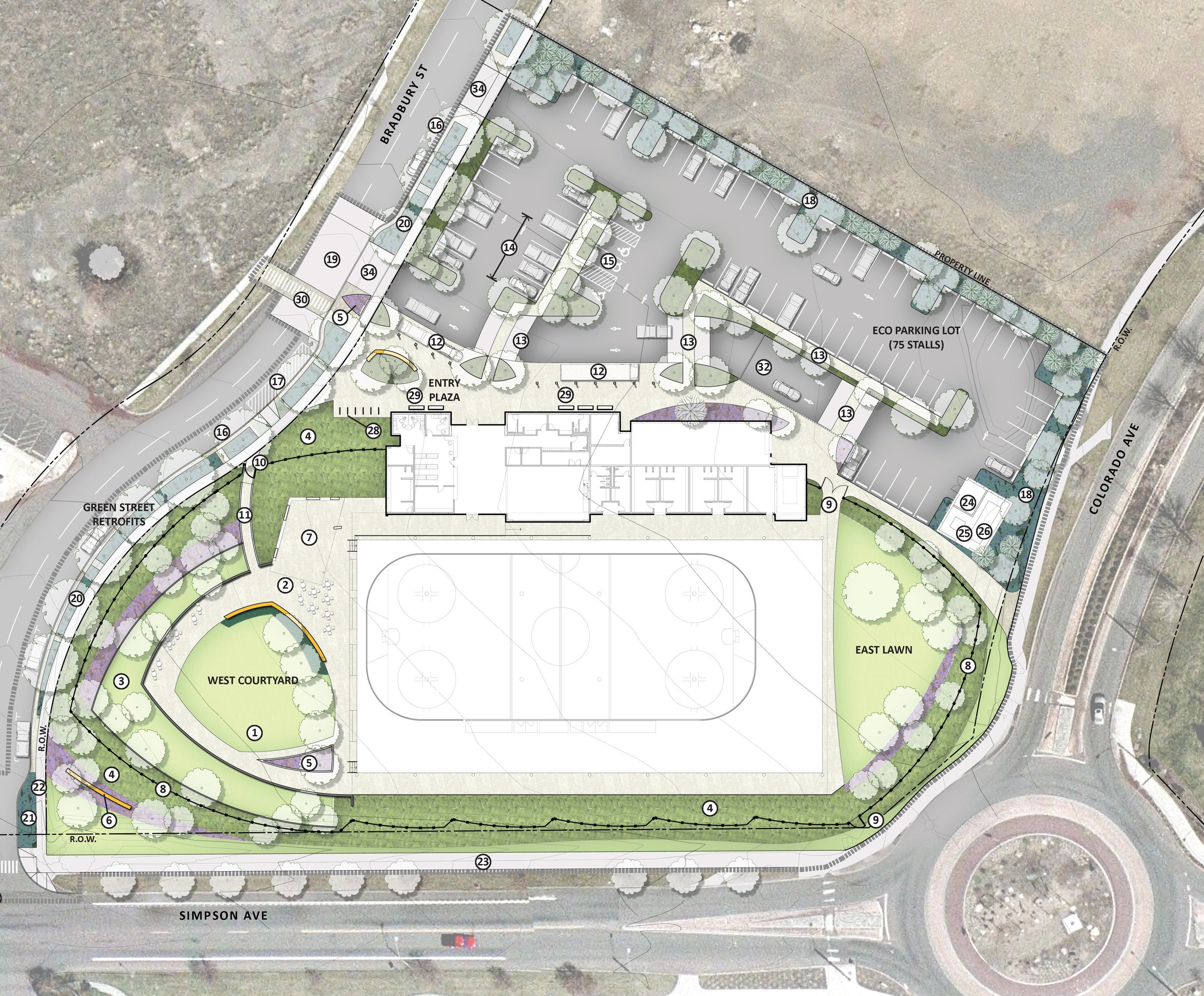 GreenWorks provided services to Bend Parks and Recreation District (BPRD) for the conversion of a former 3.25 acre parking lot into a new open-air pavilion that will house an Olympic-standard ice rink in the winter and numerous activities such as tennis, basketball, and concerts in the summer. The site was redeveloped with an iconic pavilion structure, support facilities, a courtyard green, and flexible lawn spaces adjacent to the pavilion for community events. Per BPRD’s direction, several Low Impact Development (LID) techniques were incorporated. For stormwater management, LID alternatives such as infiltration swales and galleries throughout the site for stormwater collection were provided. Other LID options include providing ample bicycle access, bicycle parking, and pedestrian connectivity. The project was completed in 2015.