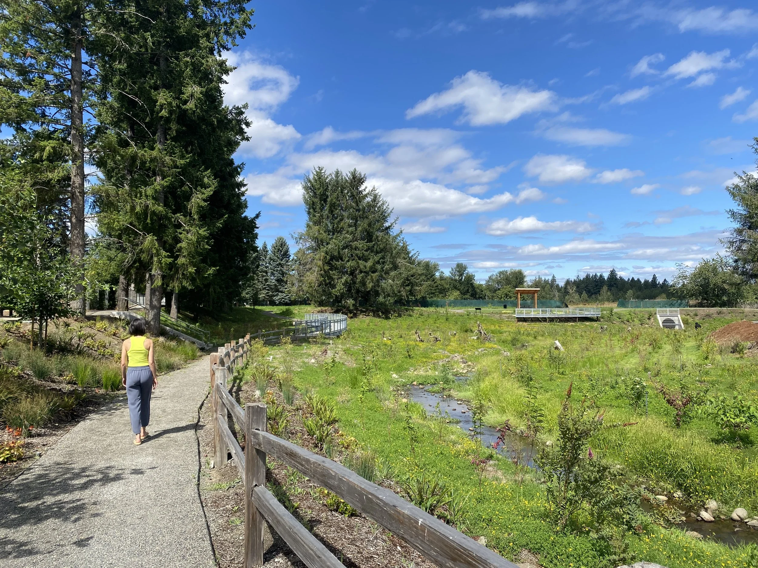 Wade Creek Park converts a man-made pond to a flowing stream and creates a community building, trails and boardwalks, a picnic shelter, habitat plantings, pollinator gardens, and an overlook.