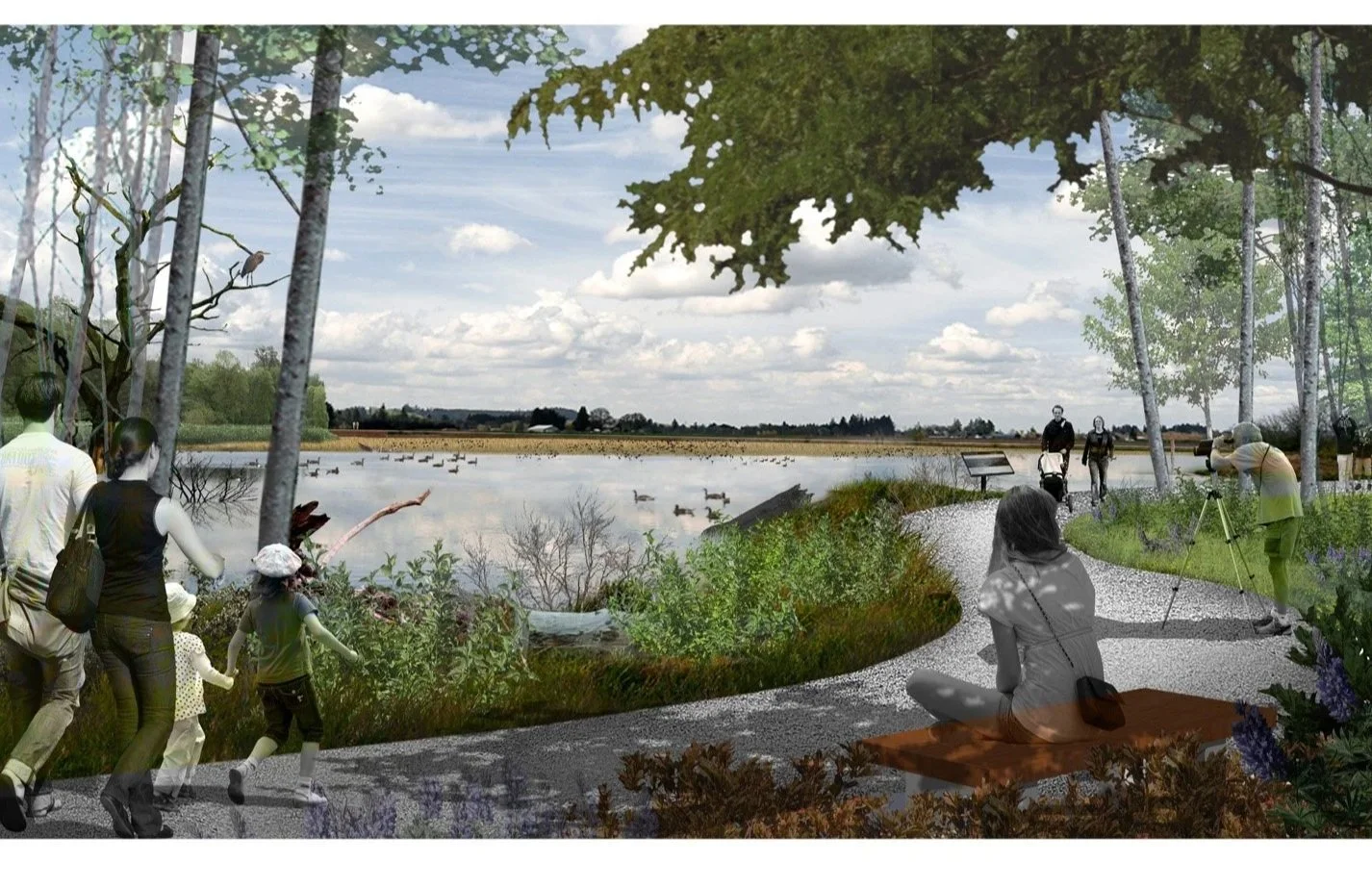 With future plans to integrate the wetlands into the wastewater treatment process as part of a natural and sustainable cleansing and cooling approach that preserves the site’s ecological and recreational significance, Clean Water Services commissioned GreenWorks as consultants who bring extensive experience in constructed wetland and green infrastructure design. In collaboration with CWS, GreenWorks developed a master plan vision for the site which included an overall site layout consisting of treatment wetlands, roads, trails, overlooks and other public spaces; a graphic representation of the water circulation path from wastewater treatment facility all the way to the Tualatin River; accompanied by a collection of artistic photorealistic renderings from various vantage points, which will collectively be used to clearly convey design intent throughout future project phases.