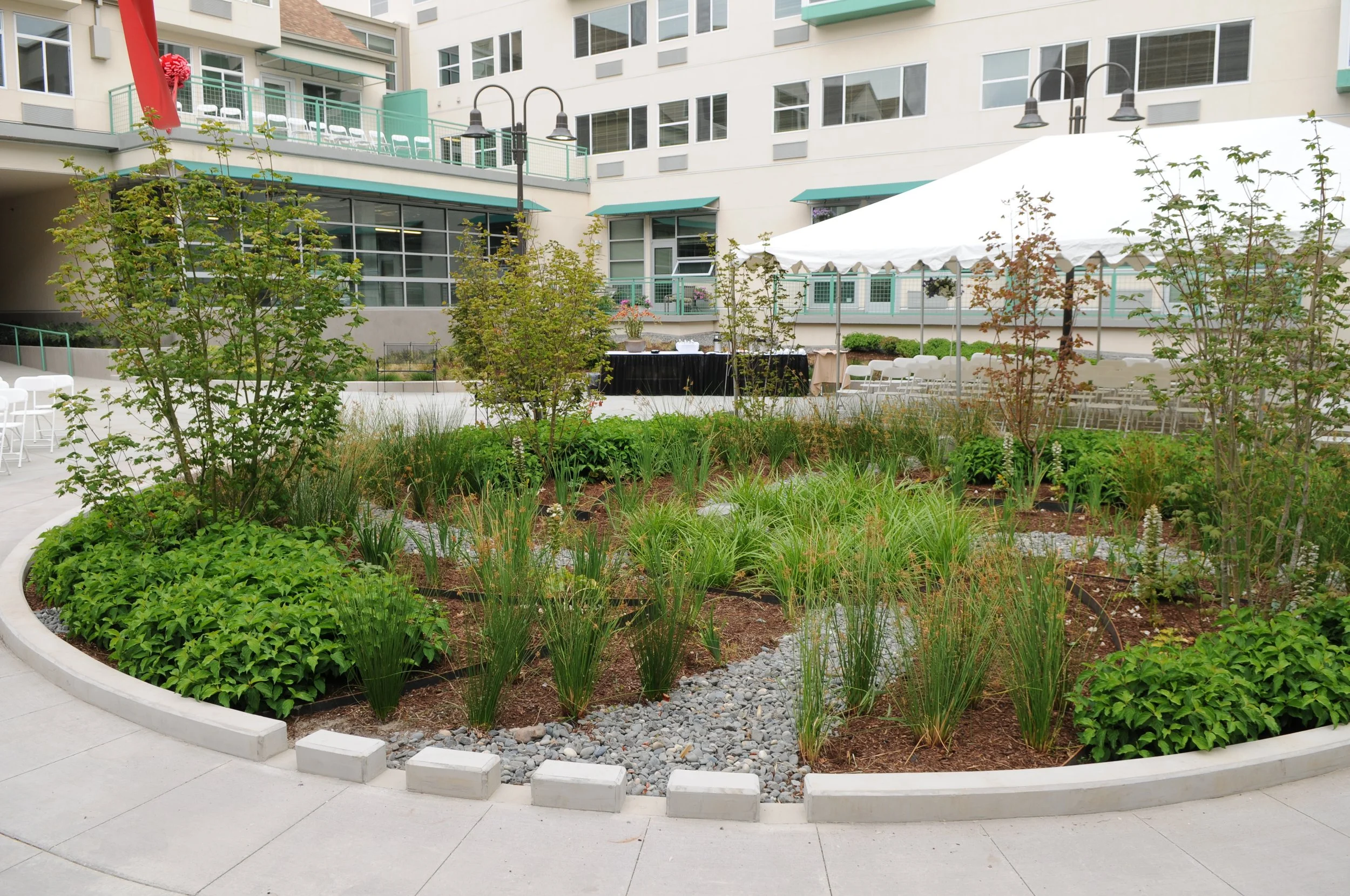 GreenWorks is designing streetscape improvements for Phase III, as well as an interior courtyard space that includes a memory care courtyard and a fountain. Significant streetscape elements include flow through planters that manage the building’s roof runoff along E Burnside and SE Ankeny Streets, and an entry plaza with special paving along and across SE 103rd Avenue extending to the Phase II section of the project. The interior courtyard space includes sculptural walls that provide a variety of spaces for individuals and for group interaction, as well as a tree-covered outdoor dining area. A circular vegetated swale handles courtyard stormwater runoff and provides a central landscape feature that echoes notions of healing and tranquility for the building’s residents.