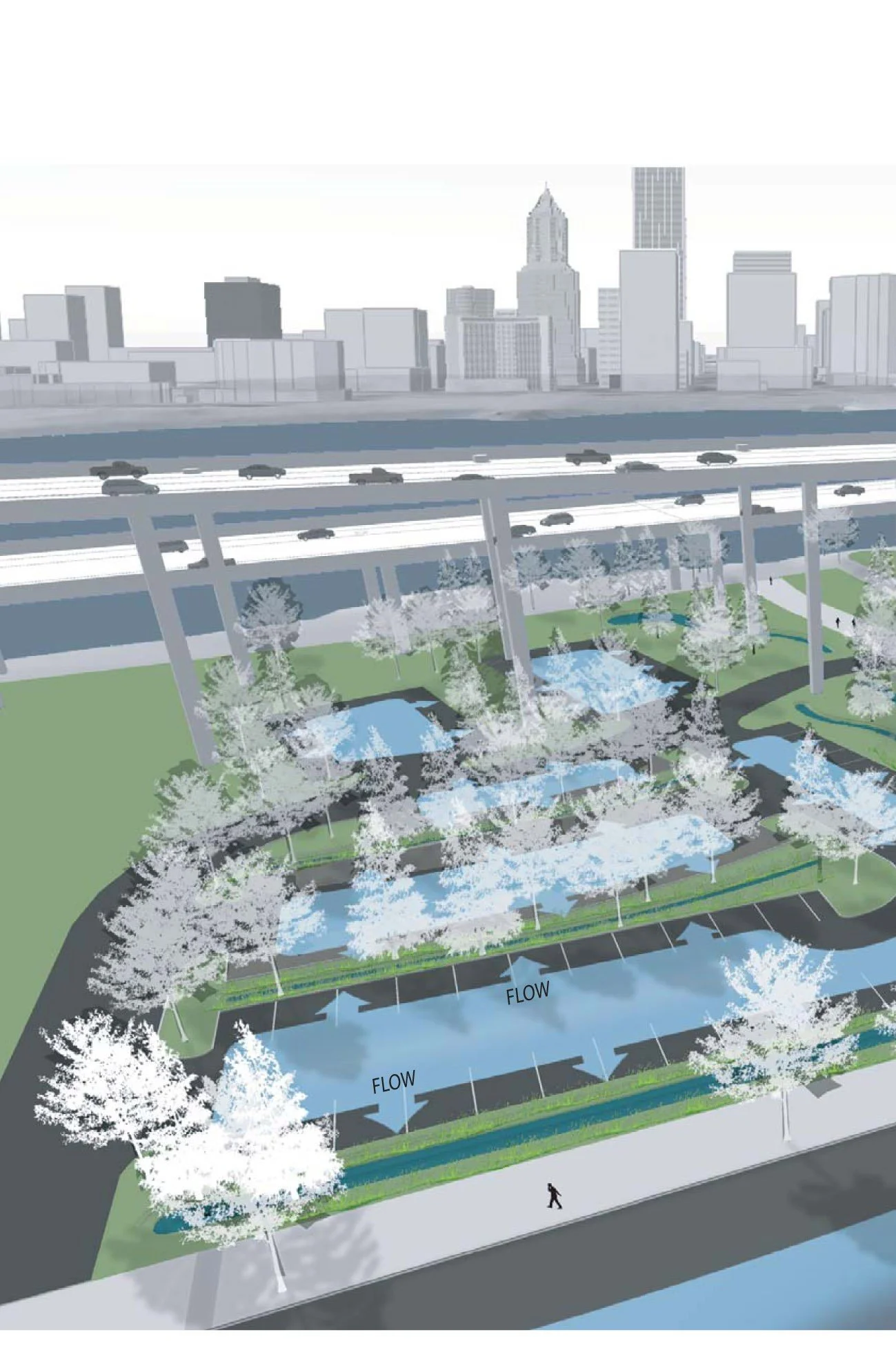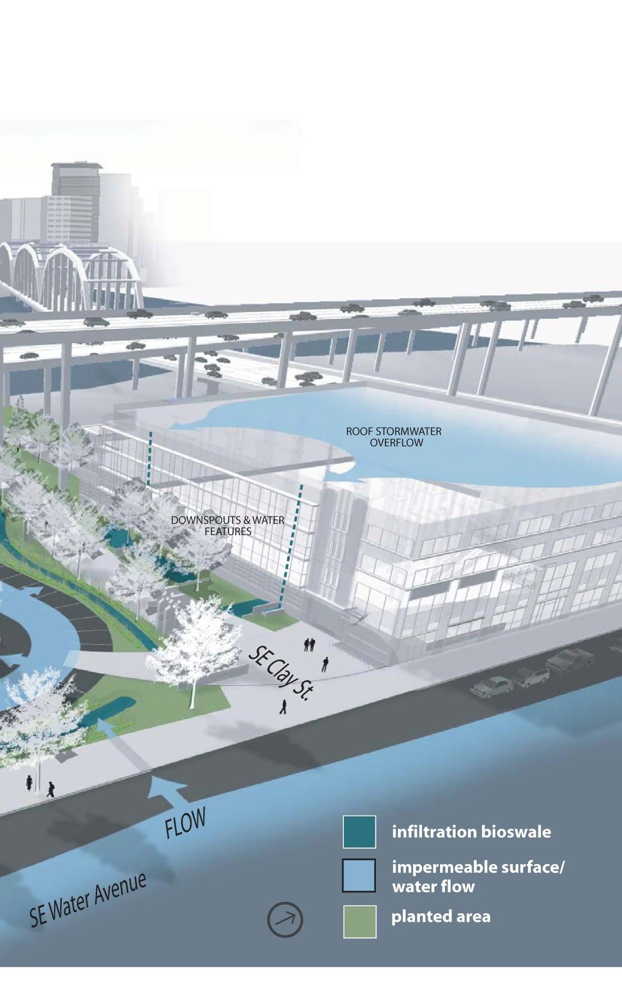 The Holman Building, redeveloped for commercial mixed – use as the RiverEast Center, includes office space for two corporate headquarters and retail uses. RiverEast is an important project in the redevelopment of Portland’s inner eastside, located adjacent to the Willamette River and Certified LEED Gold. Major site design components included converting the Clay Street ROW adjacent to the building into a pedestrian plaza that provides a connection for eastside neighborhoods to the Willamette River Greenway. Unique features include creating a green parking lot, retrofitting Water Avenue to a Green Street, conveying and treating rooftop runoff with artistic downspouts and stormwater basins, and re-using recycled materials from building demolition for site wall features. The project exceeds City of Portland standards for stormwater management by treating roof runoff from the building through stormwater flow-through planters. The development was coordinated with many local agencies including Portland Development Commission, Portland Bureau of Planning, Portland Bureau of Transportation, and Bureau of Environmental Services. The project relies heavily on native planting schemes to conserve water consumption and promote bio-diversity. GreenWorks services included schematic design, design development, and construction documentation services.
